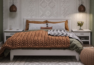 Если вы мечтаете о романтичной и элегантной спальне, обратите внимание на коллекцию «Онтарио». Она подойдет для интерьеров в стиле неоклассика или контемпорари. Благодаря изогнутым дизайнерским ножкам и декору в виде позолоченной паутины изделия выглядят изящно и утонченно. В сочетании с ворсистыми коврами и велюровым текстилем получится стильный интерьер с нотками французской классики.