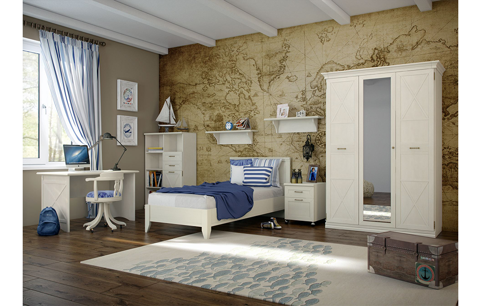 Представленный комплект содержит все необходимое для обустройства элегантной молодежной комнаты в стиле кантри, прованс или классика. Длинная односпальная кровать с высокой спинкой на скошенных ножках поможет с комфортом разместиться на ночной отдых и облегчит уборку подкроватного пространства. Лаконичный письменный стол идеально подойдет подростку или студенту. Трехстворчатый шкаф и двухсекционный шкаф-тумба позволят рационально использовать полезную площадь. В роли дополнительных систем хранения выступают компактная тумбочка и настенная полка. Светлый оттенок покрытия «валенсия» подчеркнут темной фурнитурой в цвете «античная бронза». За счет четкой геометрии, изящных карнизов, тонких линий фахверков и фрезеровки мебель выглядит легкой и визуально расширяет помещение. Невысокие цоколи хорошо скрывают регулируемые металлические опоры. При изготовлении комплекта производитель использовал такие экологичные материалы, как ЛДСП, МДФ-профиль и ДВП.