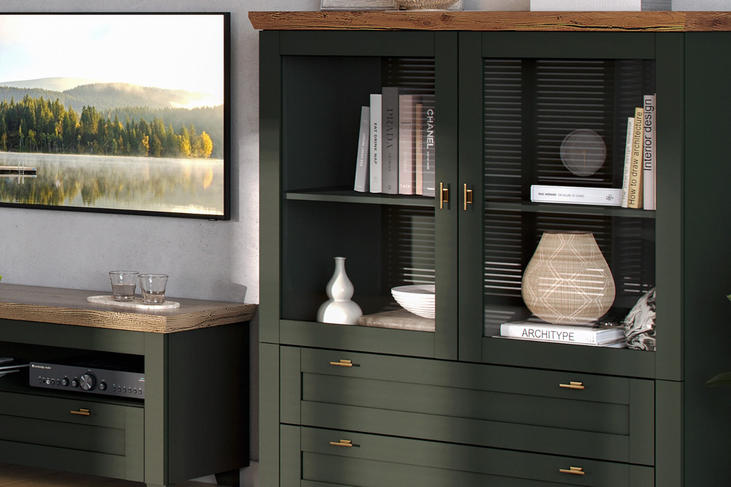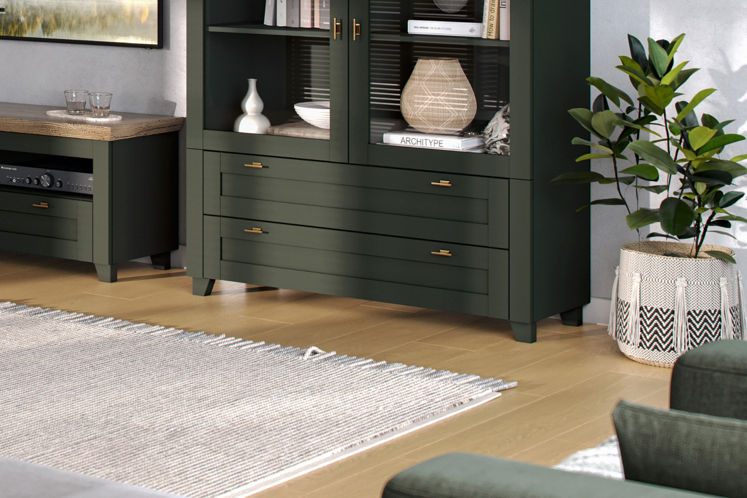• Шкаф низкий с рамочными фасадами и двумя выдвижными ящиками;