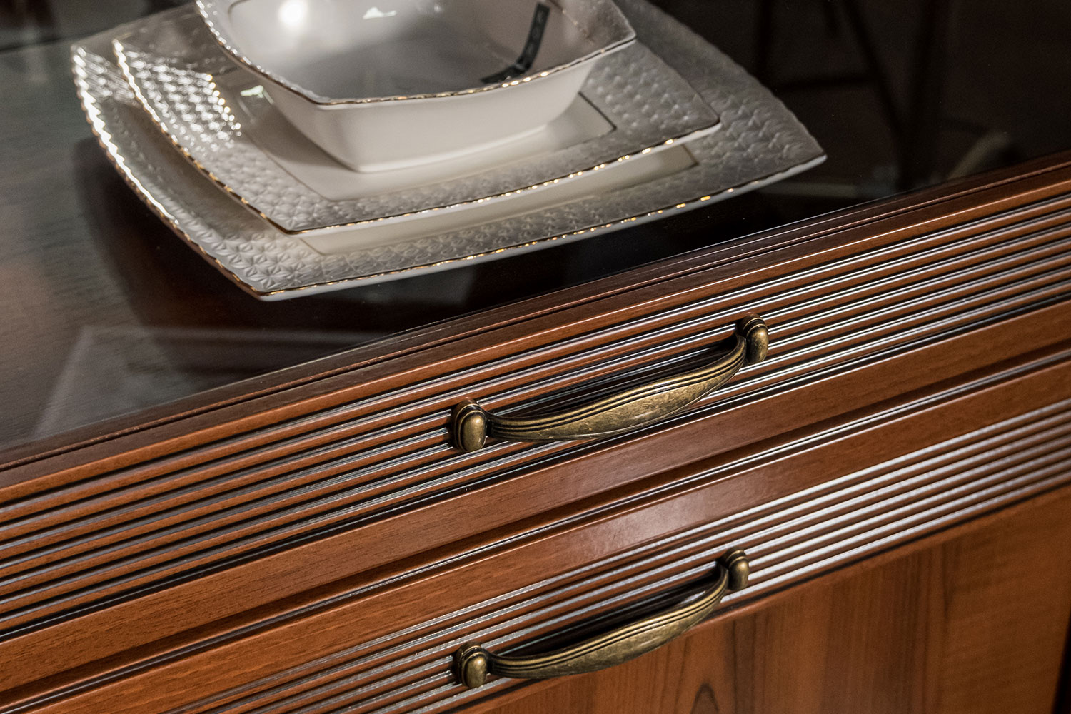 - Мебель выполнена в цвете «клен старый». Фасады вручную покрыты патиной и испанским лаком, который отличается повышенной атмосферо- и светостойкостью и не меняет цвет со временем;